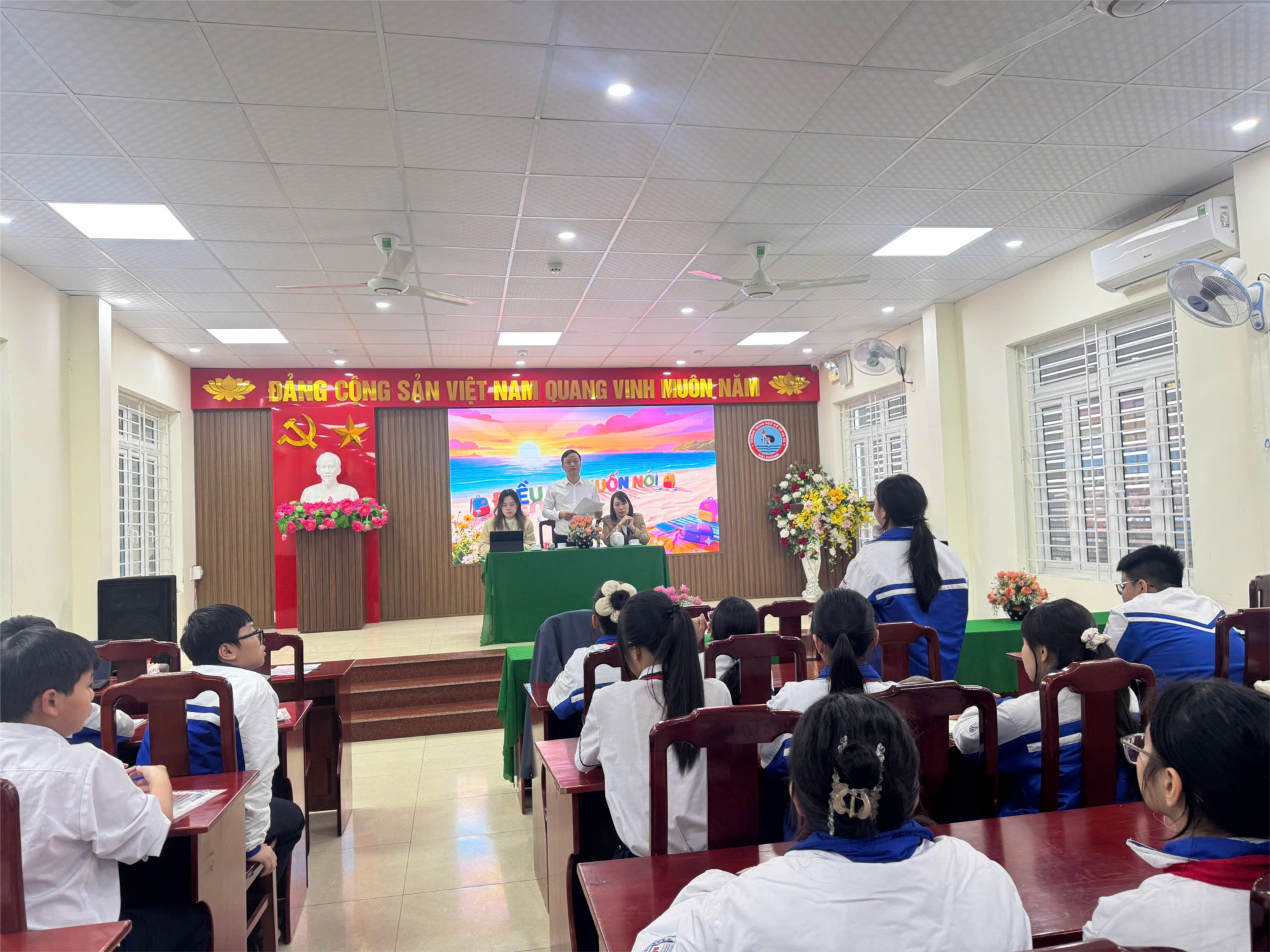 Tiếp theo là nội dung Hội nghị lớp trưởng - một diễn đàn dân chủ và ý nghĩa để tiếng nói của các em học sinh được đến gần hơn với nhà trường. Trước đó, Liên đội đã triển khai phát phiếu "Điều em muốn nói" đến từng lớp để tổng hợp những ý kiến, nguyện vọng của các em về học tập và sinh hoạt. Tại hội nghị, thầy giáo Bùi Quang Thiện – Phó Hiệu trưởng nhà trường đã đại diện Ban Giám hiệu trực tiếp giải đáp các thắc mắc và đưa ra những lời khuyên bổ ích, giúp các em học sinh yên tâm và tự tin hơn trong môi trường học đường.