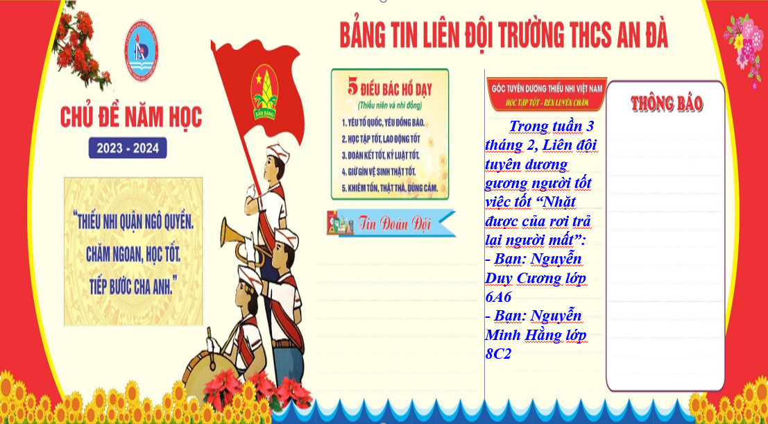 Nét đẹp này được gìn giữ thông qua những việc làm tử tế đã lan tỏa và gieo vào lòng mỗi người về niềm tin, tình người. Trong tháng 2, Liên đội tuyên dương em Nguyễn Duy Cương lớp 6A6 và em em Nguyễn Minh Hằng lớp 8C2 đã nhặt ví tiền và gửi cô giáo Tổng phụ trách để nhờ thông báo trả lại cho người mất. Số tiền nhặt được đã được trả lại kịp thời cho người mất là bạn bạn học sinh lớp 7B1 và 6A5. Hành động của hai em là một bông hoa ngát hương trong vườn hoa việc tốt của nhà trường.