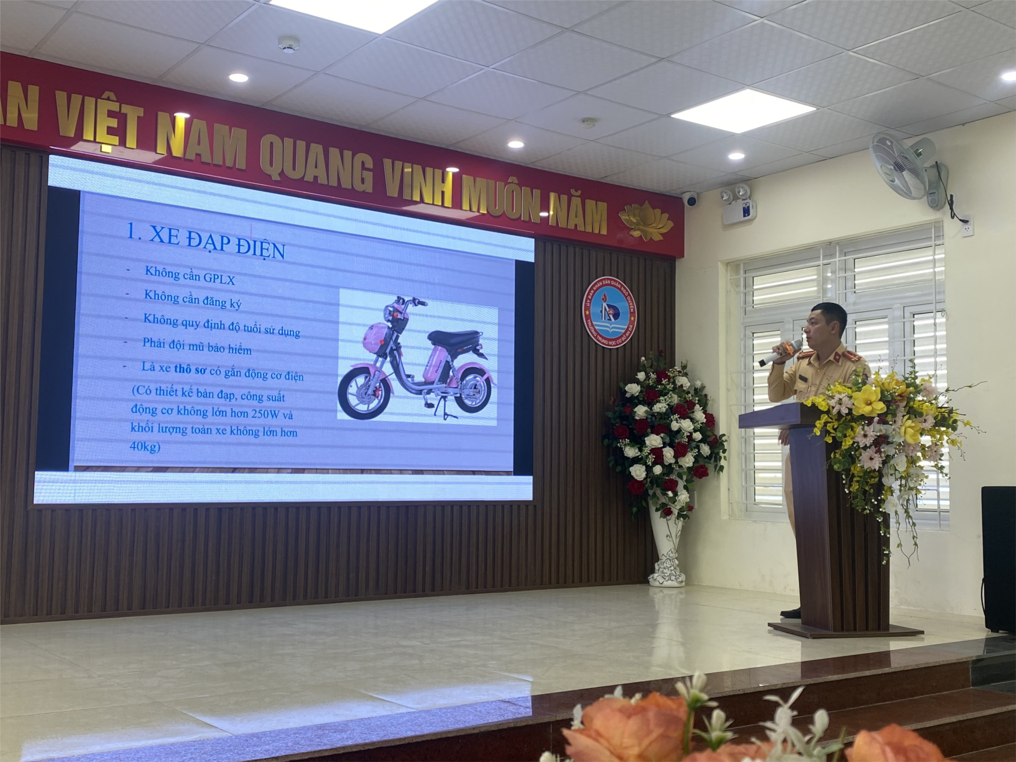 Tại buổi tuyên truyền, các cán bộ Công an quận đã thông tin đến toàn thể giáo viên và học sinh nhà trường về tình trạng vi phạm luật An toàn giao thông đường bộ của một bộ phận thanh, thiếu niên hiện nay, nhất là việc tham gia giao thông không đội mũ bảo hiểm khi ngồi trên xe mô tô, xe gắn máy, xe đạp điện; tình trạng phóng nhanh, vượt ẩu, lạng lách, đánh võng, đua xe trái phép; các vấn đề sử dụng các loại xe đạp, xe máy điện cho lứa tuổi học sinh và các hình thức lừa đảo qua mạng…