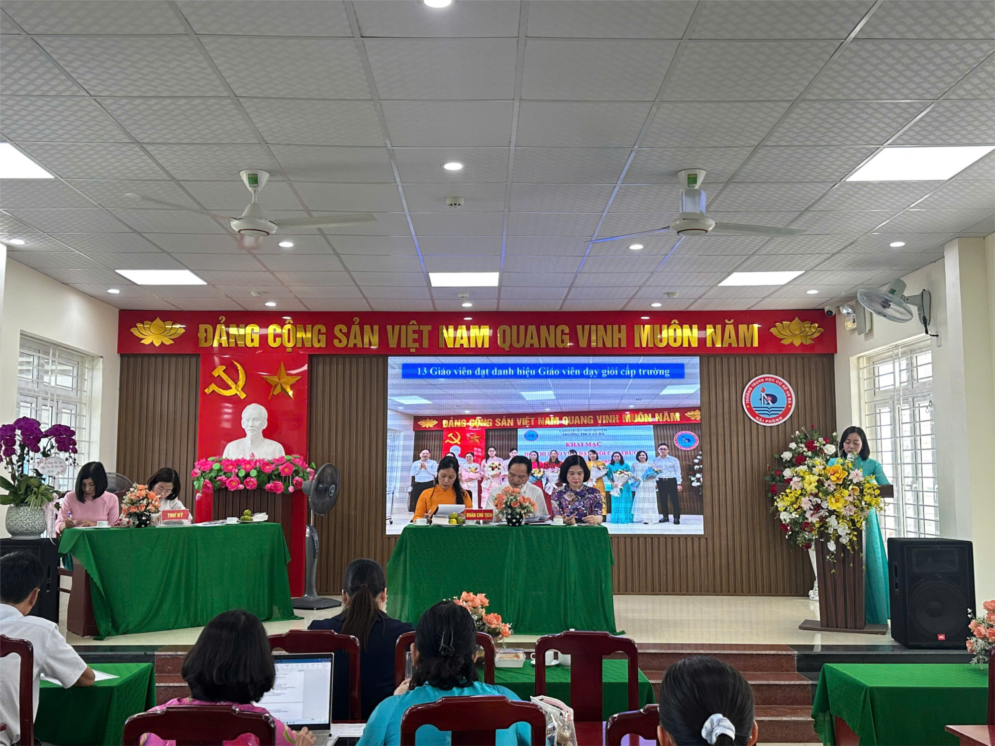 Thay mặt Ban giám hiệu, thầy Vũ Thế Tuyển - Hiệu trưởng nhà trường, đã trình bày Báo cáo kiểm điểm việc thực hiện Nghị quyết Hội nghị năm học 2024 – 2025 và phương hướng, nhiệm vụ năm học 2025 – 2026. Báo cáo nêu rõ: Năm học vừa qua, tập thể sư phạm trường THCS An Đà đã đạt được nhiều kết quả đáng tự hào trong công tác giảng dạy và các phong trào thi đua. Chất lượng giáo dục đại trà và mũi nhọn đều có bước tiến vững chắc: 100% HS lớp 9 được công nhận tốt nghiệp THCS; tỉ lệ học sinh thi đỗ vào 10 - THPT đạt 94% (vượt chỉ tiêu 14%), điểm trung bình 3 môn thi đạt 7.99 (đứng thứ 6 toàn thành phố), trong đó môn Toán xếp thứ nhất thành phố. Các tổ chức đoàn thể như Công đoàn, Chi đoàn, Liên đội đều vững mạnh, góp phần quan trọng vào thành tích chung của nhà trường.
