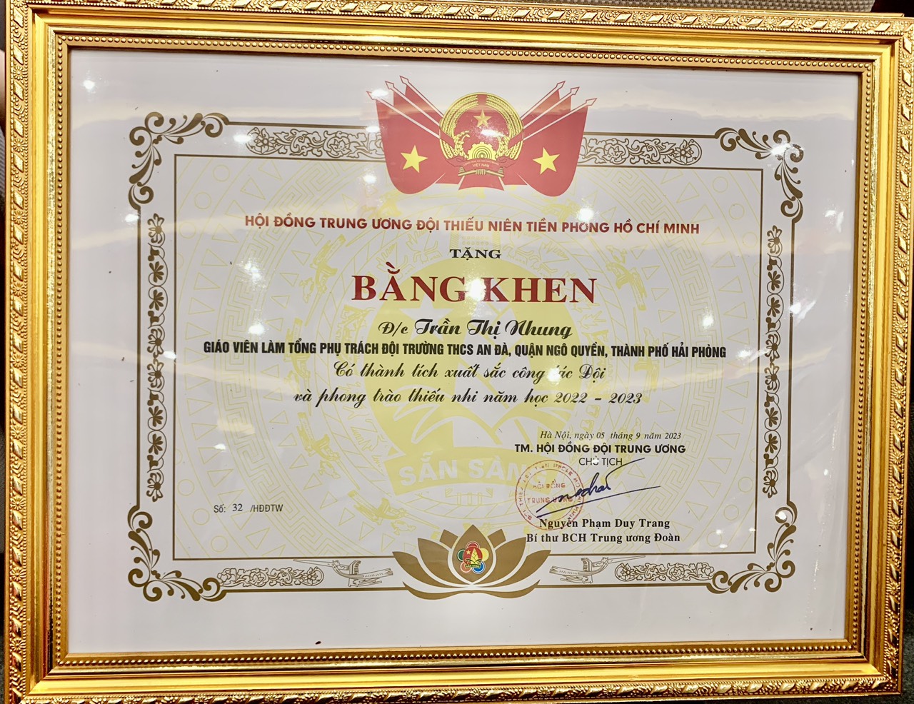 Cá nhân đ/c Trần Thị Nhung - Giáo viên làm TPT Đội nhà trường đã được nhận Bằng khen của Hội đồng đội Trung ương "Đã có thành tích xuất sắc trong công tác Đội và phong trào thiếu nhi năm học 2022 - 2023”