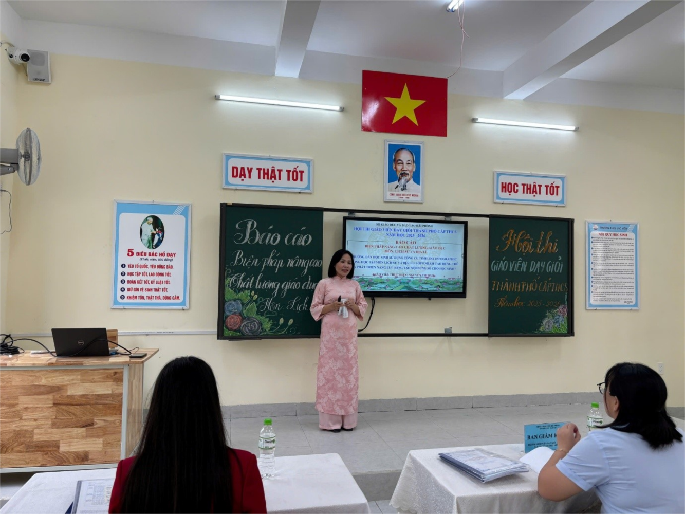 Ghi nhận tại các tiết dạy thực hành, tinh thần đổi mới phương pháp giảng dạy được thể hiện rõ nét. Điểm nhấn nổi bật là việc ứng dụng hiệu quả các mô hình dạy học hiện đại như Lớp học đảo ngược (Flipped Classroom) và Dạy học dự án (PBL). Đáng chú ý là việc khai thác hiệu quả các công cụ hỗ trợ từ AI kết hợp cùng Canva, Quizizz, Padlet... giúp tối ưu hóa thời gian thiết kế học liệu và tạo ra không gian tương tác đa chiều. Sự kết hợp nhuần nhuyễn giữa kiến thức chuyên sâu và kỹ năng sư phạm truyền cảm hứng của các cô giáo đã nhận được những phản hồi tích cực từ Hội đồng giám khảo.