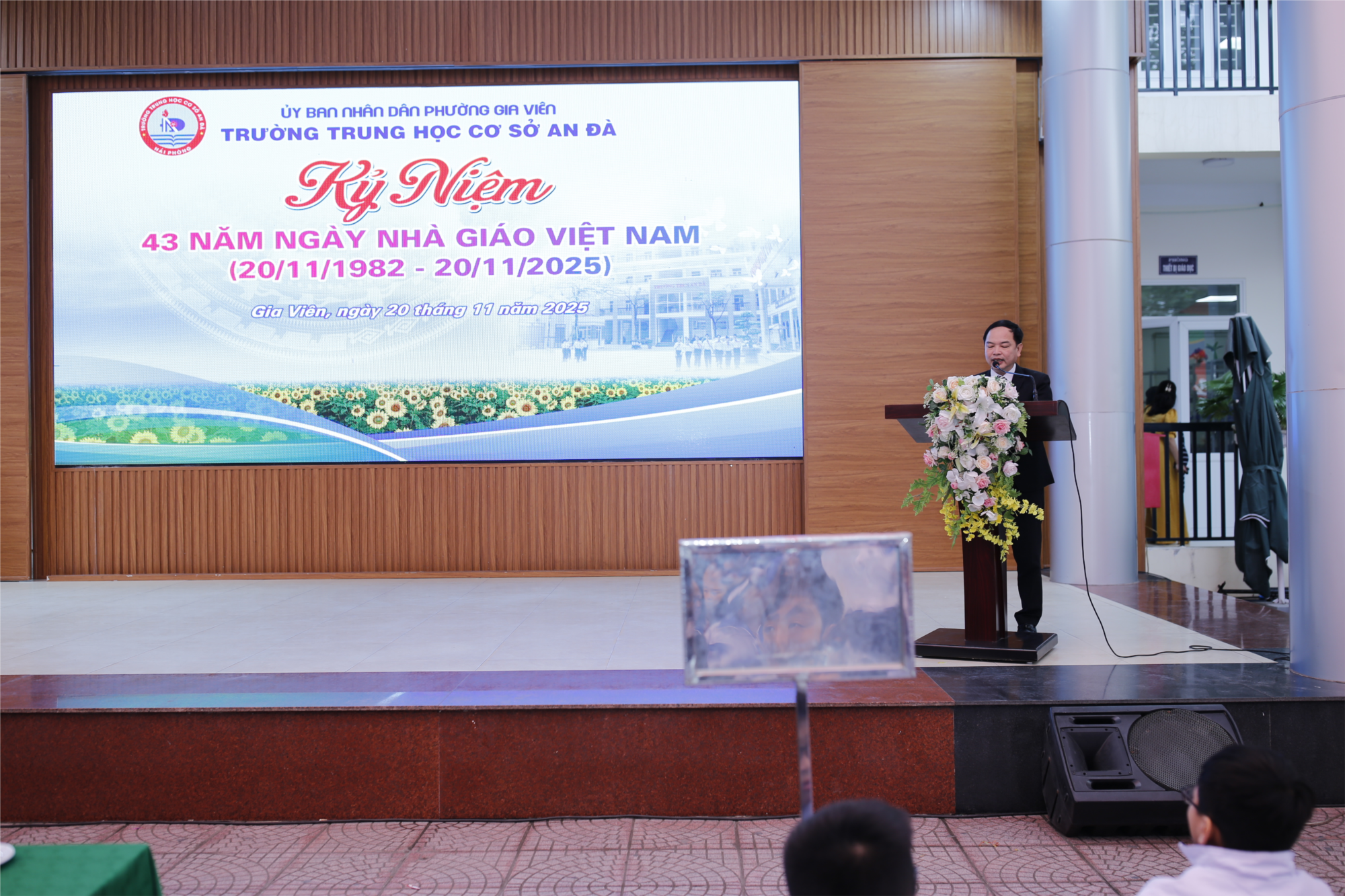 Phần trọng tâm của buổi lễ là bài phát biểu đầy tâm huyết và xúc động của thầy Vũ Thế Tuyển, Bí thư Chi bộ, Hiệu trưởng nhà trường. Thầy đã ôn lại truyền thống vẻ vang của ngành giáo dục, khẳng định vai trò và sự hy sinh thầm lặng của đội ngũ giáo viên THCS An Đà. Thầy nhấn mạnh: “Nghề giáo là một nghề cao quý, đòi hỏi sự kiên trì, lòng tận tâm và tình yêu thương vô bờ bến. Mỗi thầy cô giáo không chỉ là người truyền đạt kiến thức, mà còn là người thắp lửa đam mê, là tấm gương sáng dẫn lối các em học sinh trưởng thành.” Lời phát biểu của thầy đã chạm đến trái tim của người nghe, khơi dậy niềm tự hào và ý thức trách nhiệm của mỗi nhà giáo.