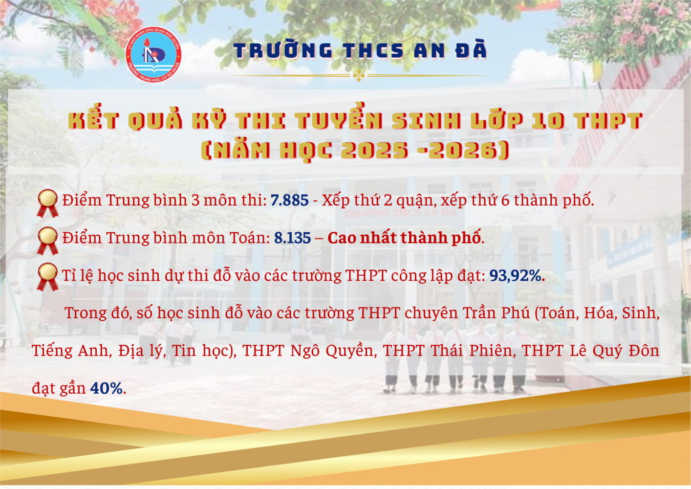 - Điểm trung bình các môn thi: 7.9885 - xếp thứ 2 quận, và xếp thứ 6 thành phố và đặc biệt điểm thi môn Toán đạt: 8.135 - cao nhất thành phố.